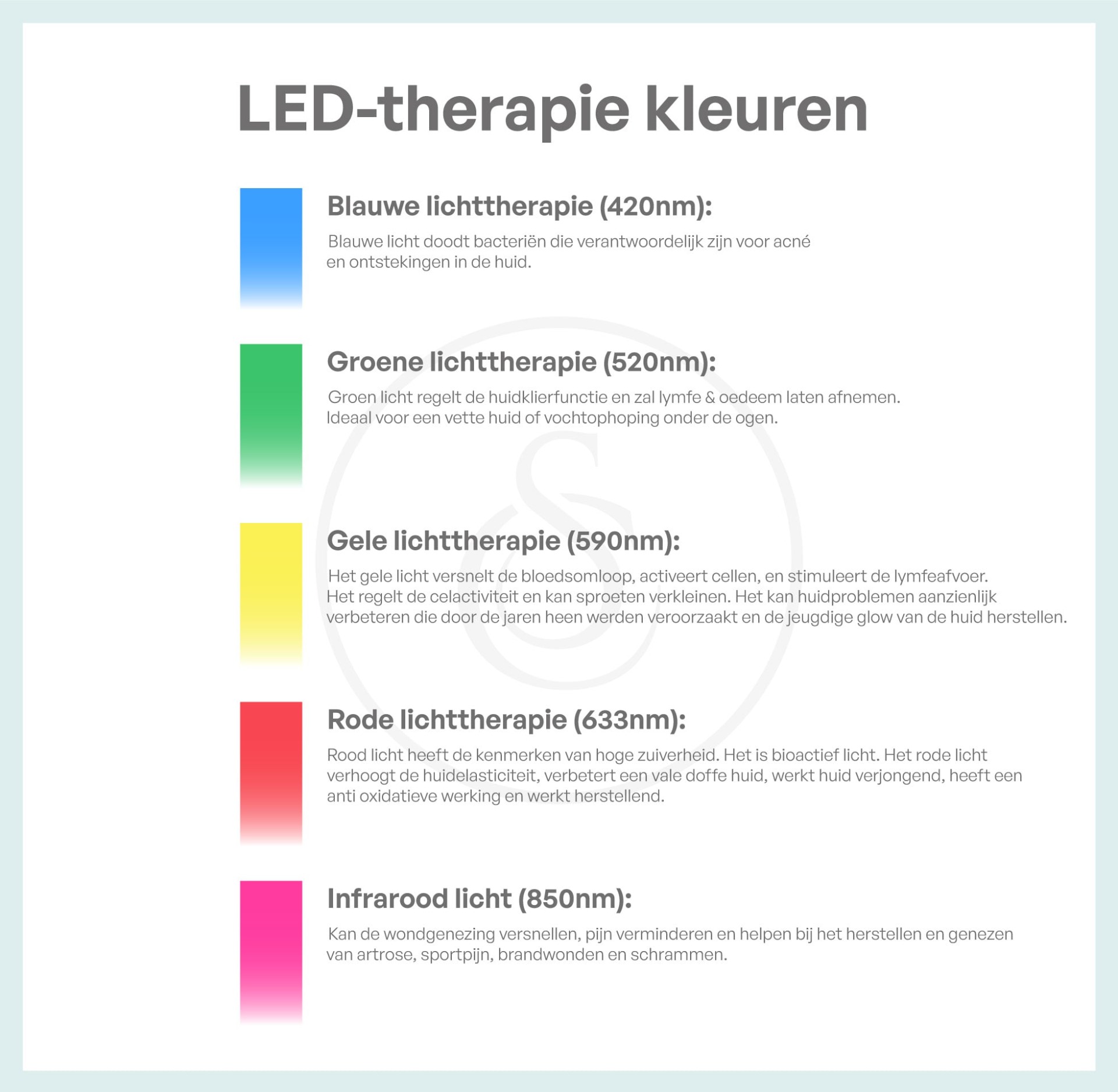 Tijdens de lichttherapie worden verschillende kleuren gebruikt, elk met hun eigen doel en effect:
